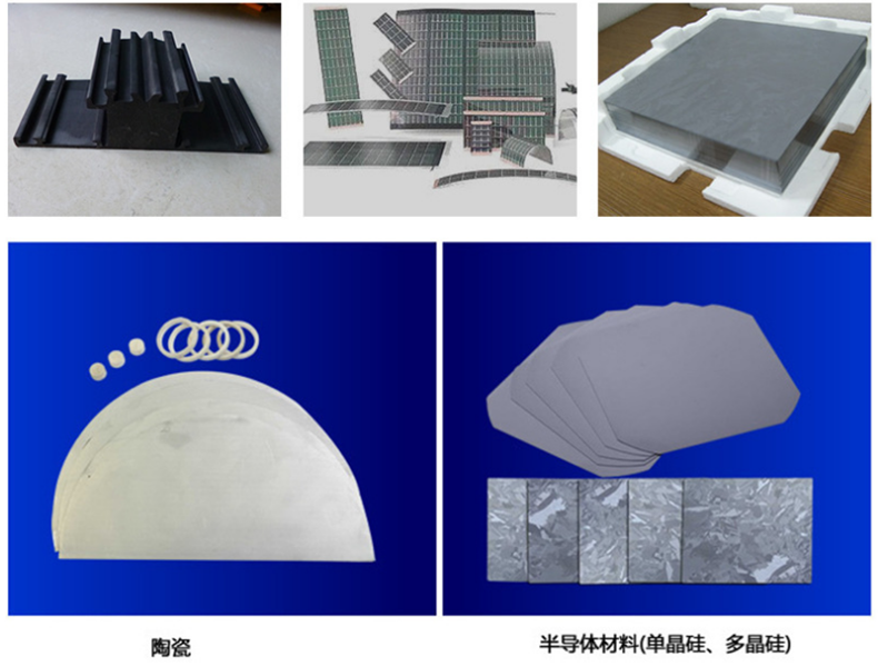 可用于切割玉石、玻璃、陶瓷、石墨、瑪瑙、紅寶石、藍寶石、亞克力、單晶硅、多晶硅、碳化硅、耐火材料、巖樣、復(fù)合材料、環(huán)氧板、鐵氧體等不導(dǎo)電材料的切片開方及直體異形的加工切割